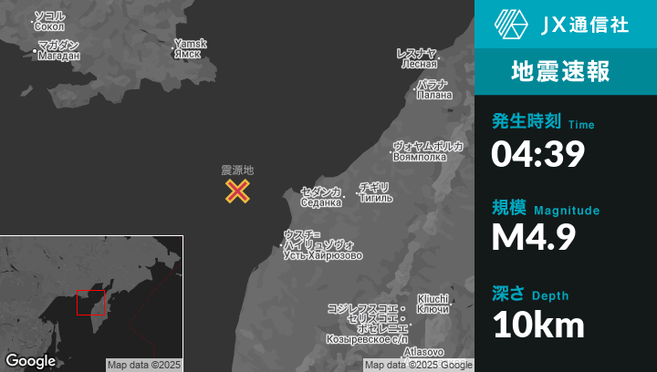 12月26日 04:39頃、ロシアのTigil’から西177kmの地点でM4.9の地震がありました。