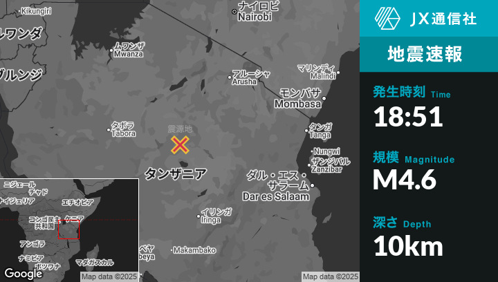 震源地タンザニアのIkungiから南東47kmの地点