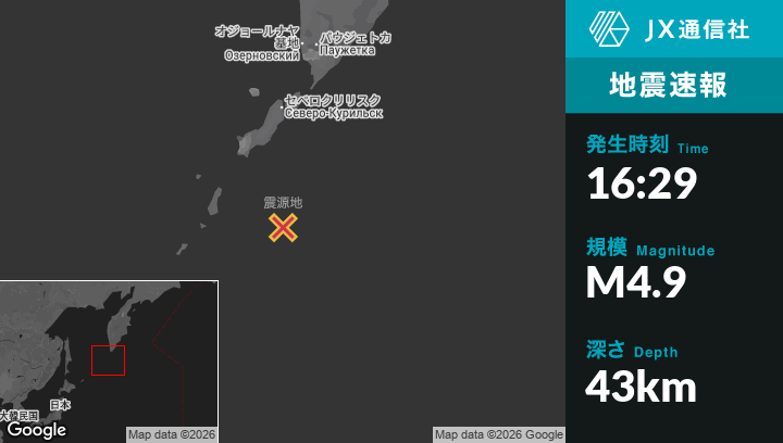 1月11日 16:29頃、ロシアのSevero-Kuril’skから南165kmの地点でM4.9の地震がありました。