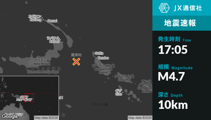 | 震源地 | パプアニューギニアのKokopoから南東193kmの地点 |