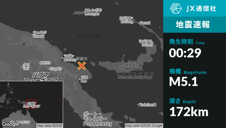 | 震源地 | パプアニューギニアのLaeから北119kmの地点 |
