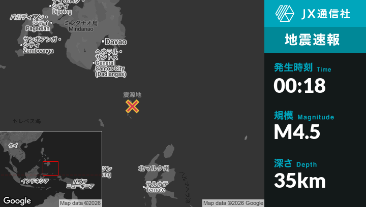 1月19日 00:18頃、フィリピンのSaranganiから南東192kmの地点でM4.5の地震がありました。