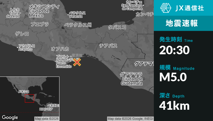 | 震源地 | メキシコのSanta Gertrudis Miramarから南南西17kmの地点 |