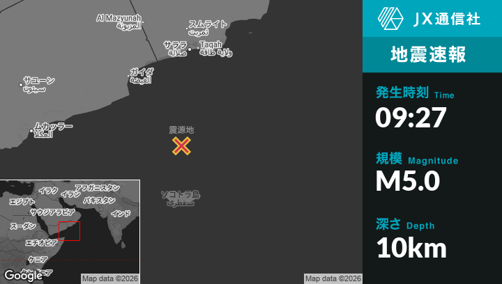 1月21日 09:27頃、イエメンのQalansīyahから北北東171kmの地点でM5.0の地震がありました。