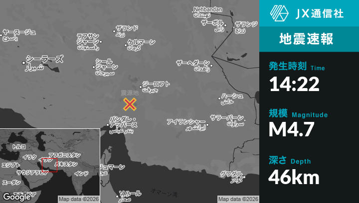1月22日 14:22頃、イランのMīnābから北110kmの地点でM4.7の地震がありました。