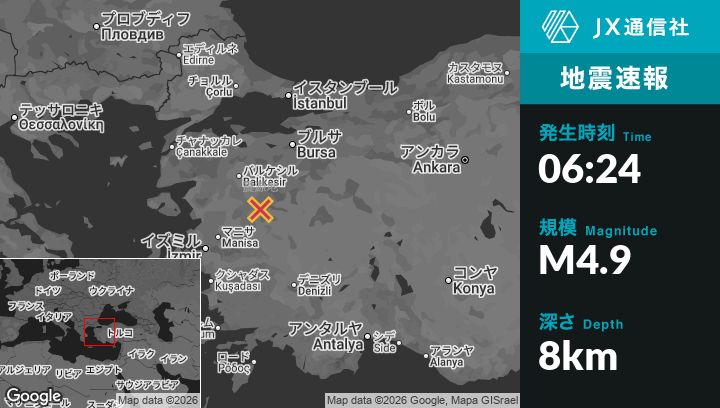 1月24日 06:24頃、トルコのSındırgıから東南東15kmの地点でM4.9の地震がありました。