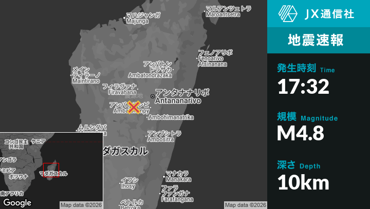 1月24日 17:32頃、マダガスカルのSoavinandrianaから南南西8kmの地点でM4.8の地震がありました。
