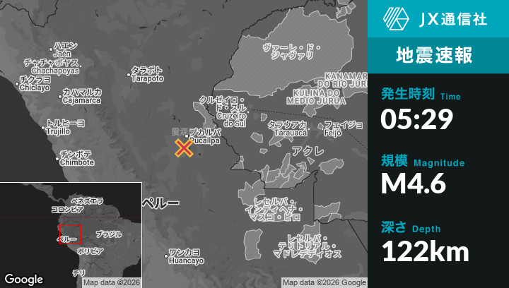 1月26日 05:29頃、ペルーのHonoriaから北北東16kmの地点でM4.6の地震がありました。