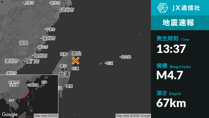 2月24日 13:37頃、台湾のYilanから南東19kmの地点でM4.7の地震がありました。
