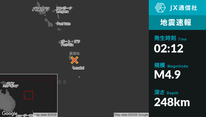 2月26日 02:12頃、バヌアツのIsangelから北北東78kmの地点でM4.9の地震がありました。
