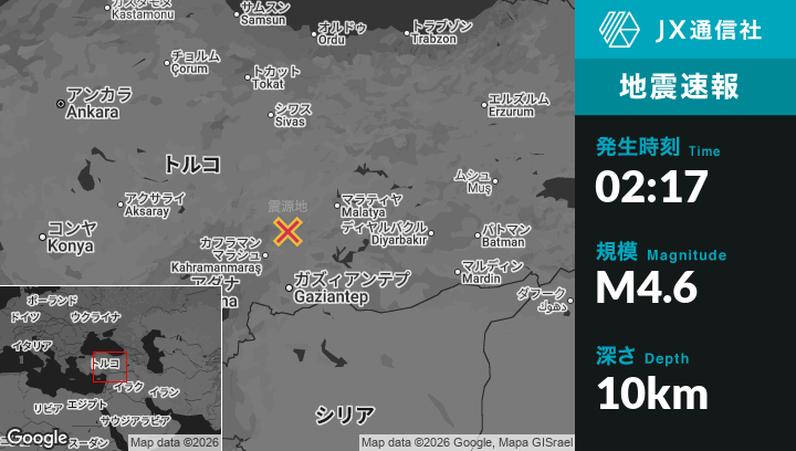 2月27日 02:17頃、トルコのNurhakから北西11kmの地点でM4.6の地震がありました。