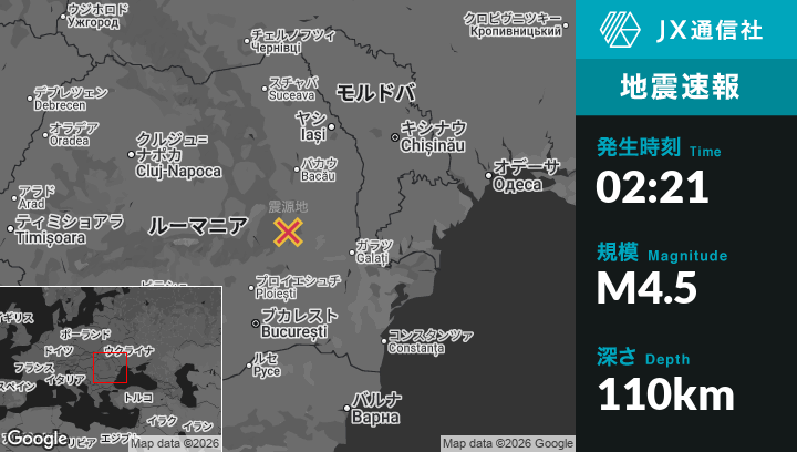 2月27日 02:21頃、ルーマニアのPaltinから東北東1kmの地点でM4.5の地震がありました。