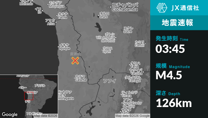 2月27日 03:45頃、チリのOllagüeから西北西65kmの地点でM4.5の地震がありました。