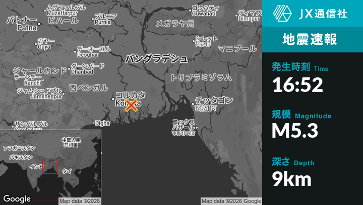 2月27日 16:52頃、インドのTākiから南東26kmの地点でM5.3の地震がありました。