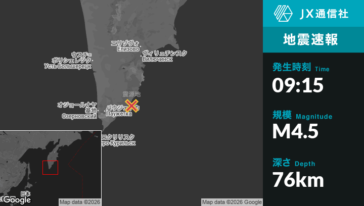 | 震源地 | ロシアのOzernovskiyから東104kmの地点 |