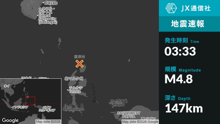 3月02日 03:33頃、インドネシアのTobeloから北119kmの地点でM4.8の地震がありました。