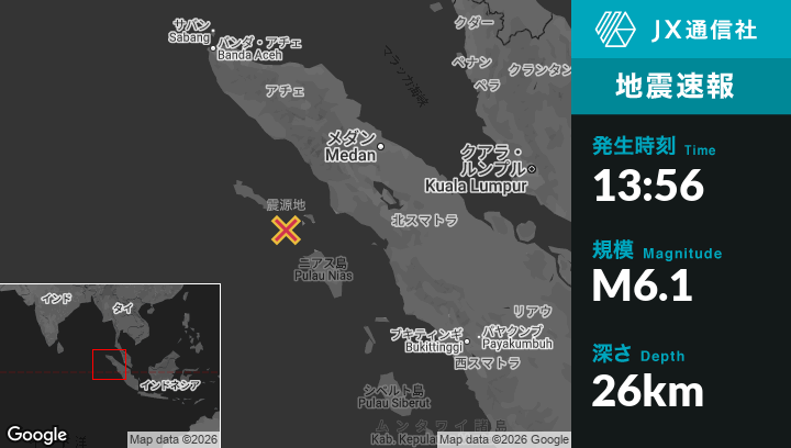 3月03日 13:56頃、インドネシアのSinabangから南東65kmの地点でM6.1の地震がありました。