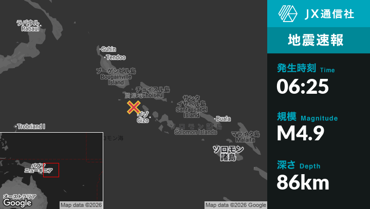 3月26日 06:25頃、ソロモン諸島のGizoから北西98kmの地点でM4.9の地震がありました。