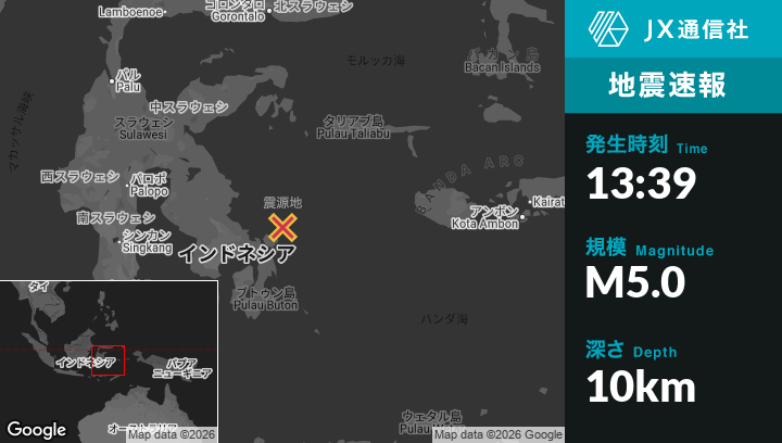 3月26日 13:39頃、インドネシアのKendariから東北東94kmの地点でM5.0の地震がありました。