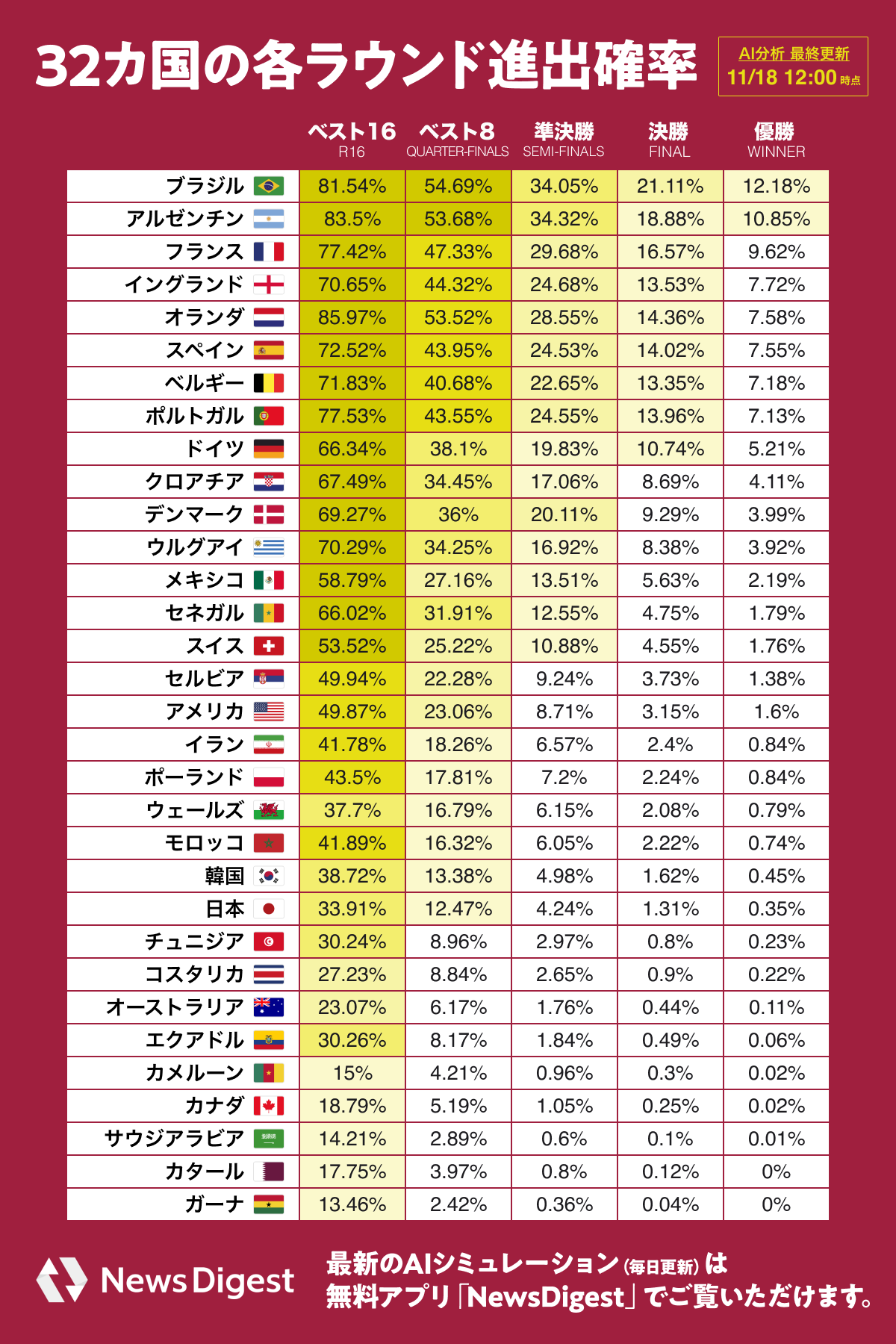 当社が開発したAIでシミュレーションを行った結果、最も優勝確率が高いブラジル(優勝確率12.2%)にアルゼンチン(10.9%)が続き、それをフランス(9.6%)、イングランド(7.7%)、オランダ(7.6%)などのヨーロッパ勢が追う展開になっています。日本の優勝確率は0.4%で、ワールドカップに出場する32ヶ国のうち、23位でした。