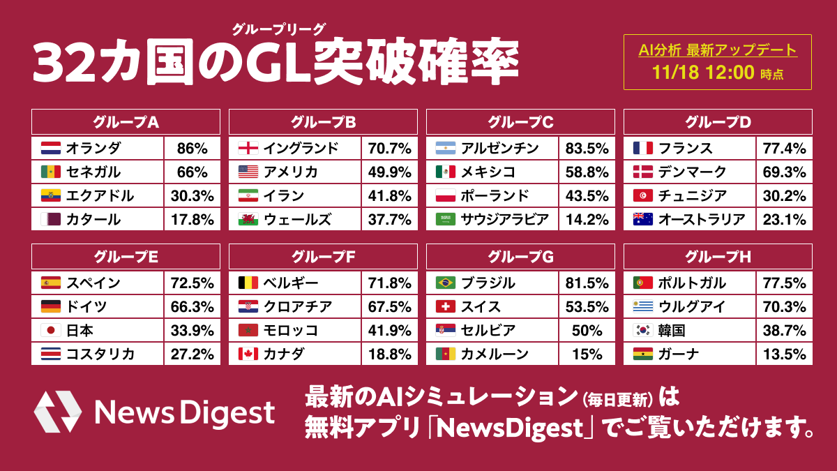 NewsDigestを運営するJX通信社は、11月20日(日)からカタールで開催されるサッカーワールドカップにあわせ、「2022サッカーW杯 勝敗確率&優勝国AIシミュレータ」をリリースしました。