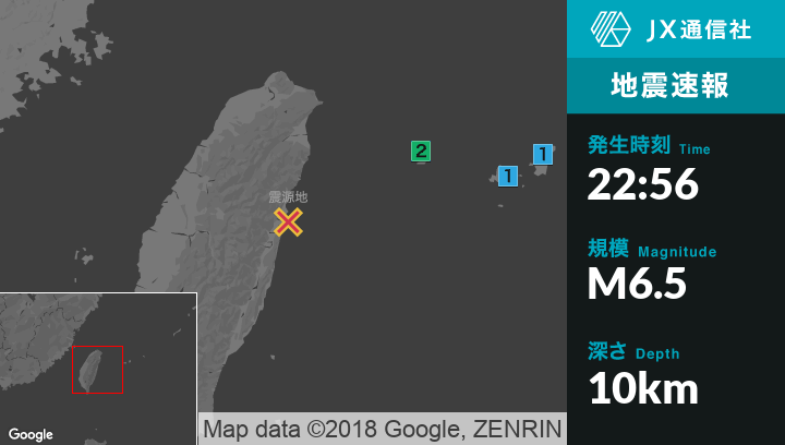 台湾沿岸でM6.5の地震 沖縄県の一部に津波予報2018年2月4日23:13午後10時56分頃、台湾沿岸でマグニチュード6.5の地震が発生。気象庁は、この影響で宮古島、与那国島、石垣島など沖縄県の一部に若干の海面変動が生じるとする津波予報を発表。
