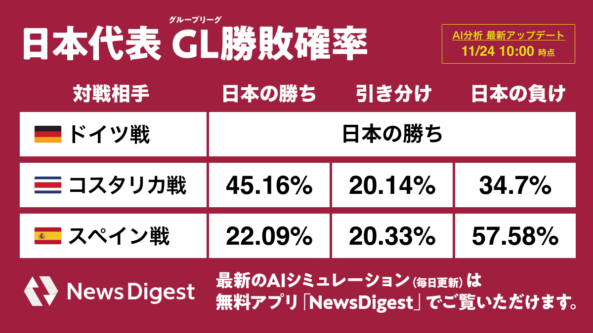 サッカー日本代表は、続けて日本時間27日19時からコスタリカ代表と、同2日4時からスペイン代表と対戦する。JX通信社が行っているシミュレーションによると、コスタリカ戦に勝利できる確率は45.2%、スペイン戦では22.1%となっている。
