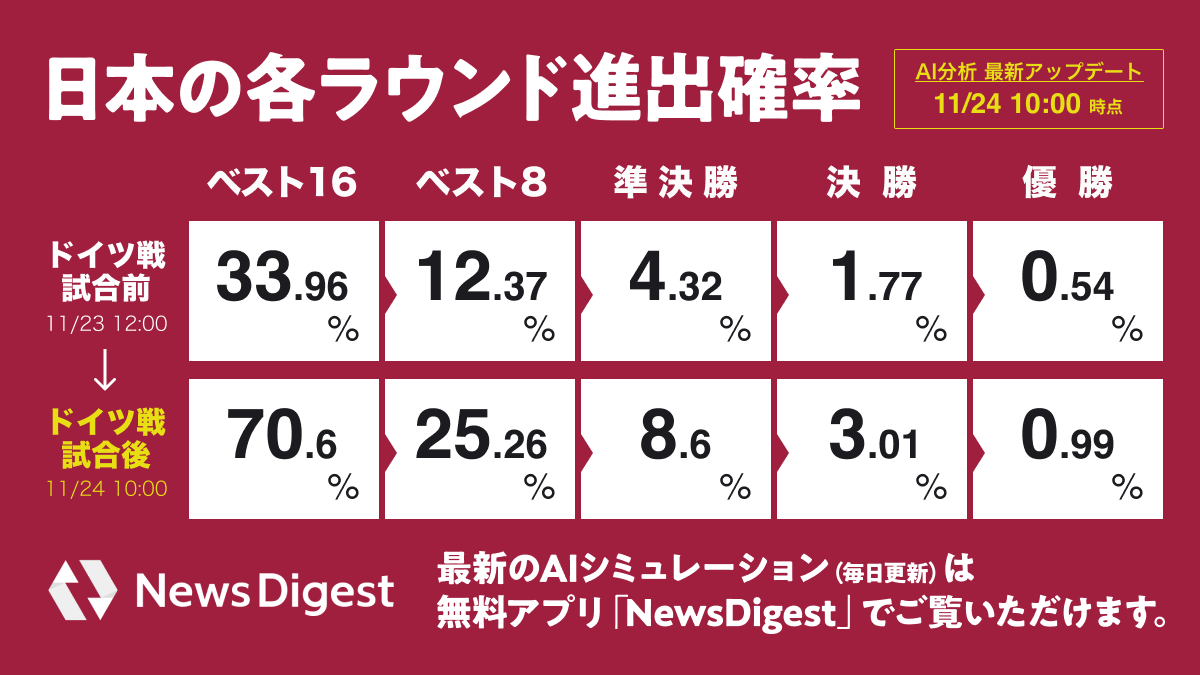 ドイツ戦前に行ったシミュレーションでは、対ドイツ戦の勝率を26.5%、グループリーグを突破する確率を34.0%と予想していた。ドイツ戦で日本代表が勝利したことをもとに再シミュレーションを行ったところ、グループリーグを突破する確率が70.6%に大きく上昇した。