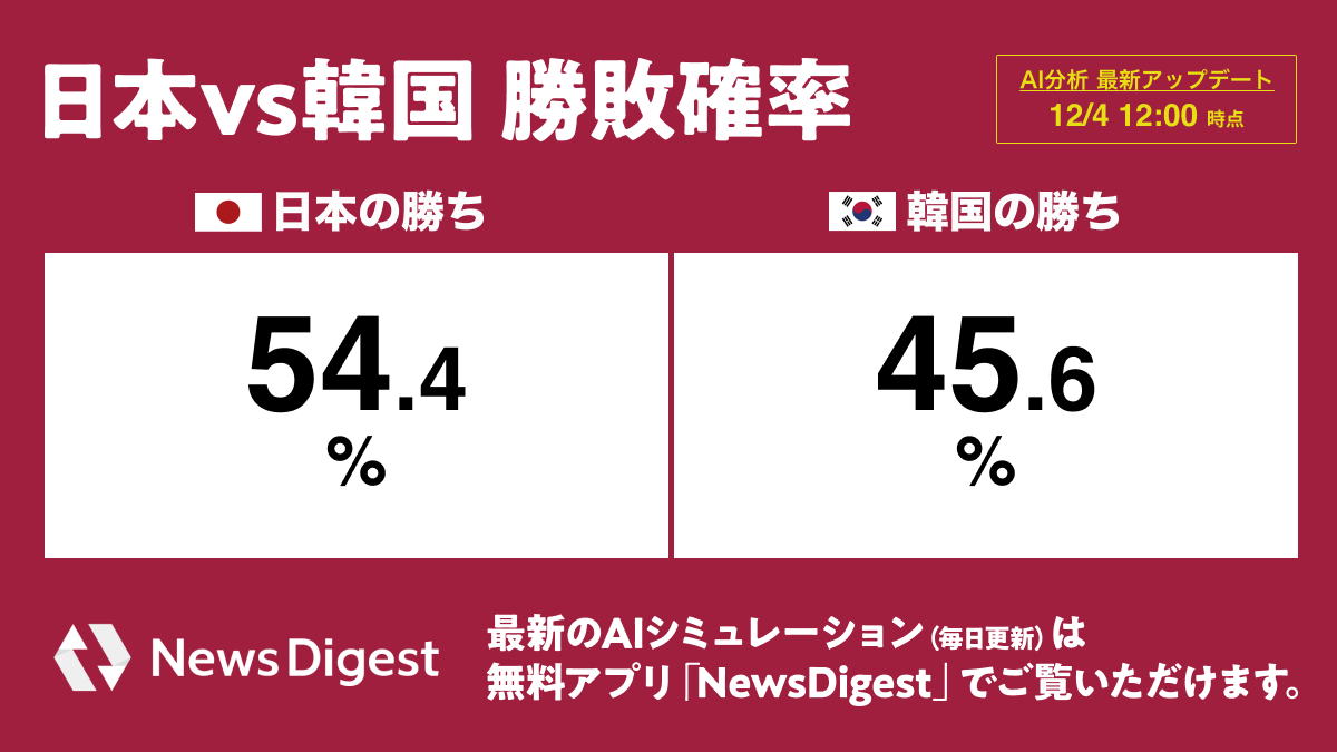 シミュレーションでは、日韓戦が実現した場合の勝率も求めた。両国の勝率は日本54.4%、韓国45.6%で、ほぼ並んだ。
